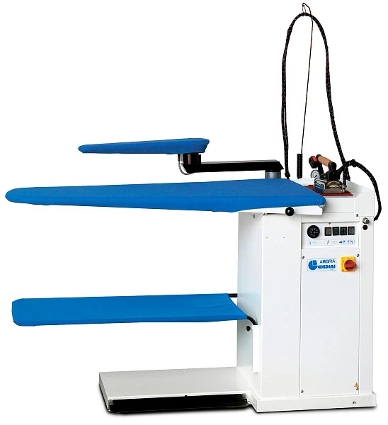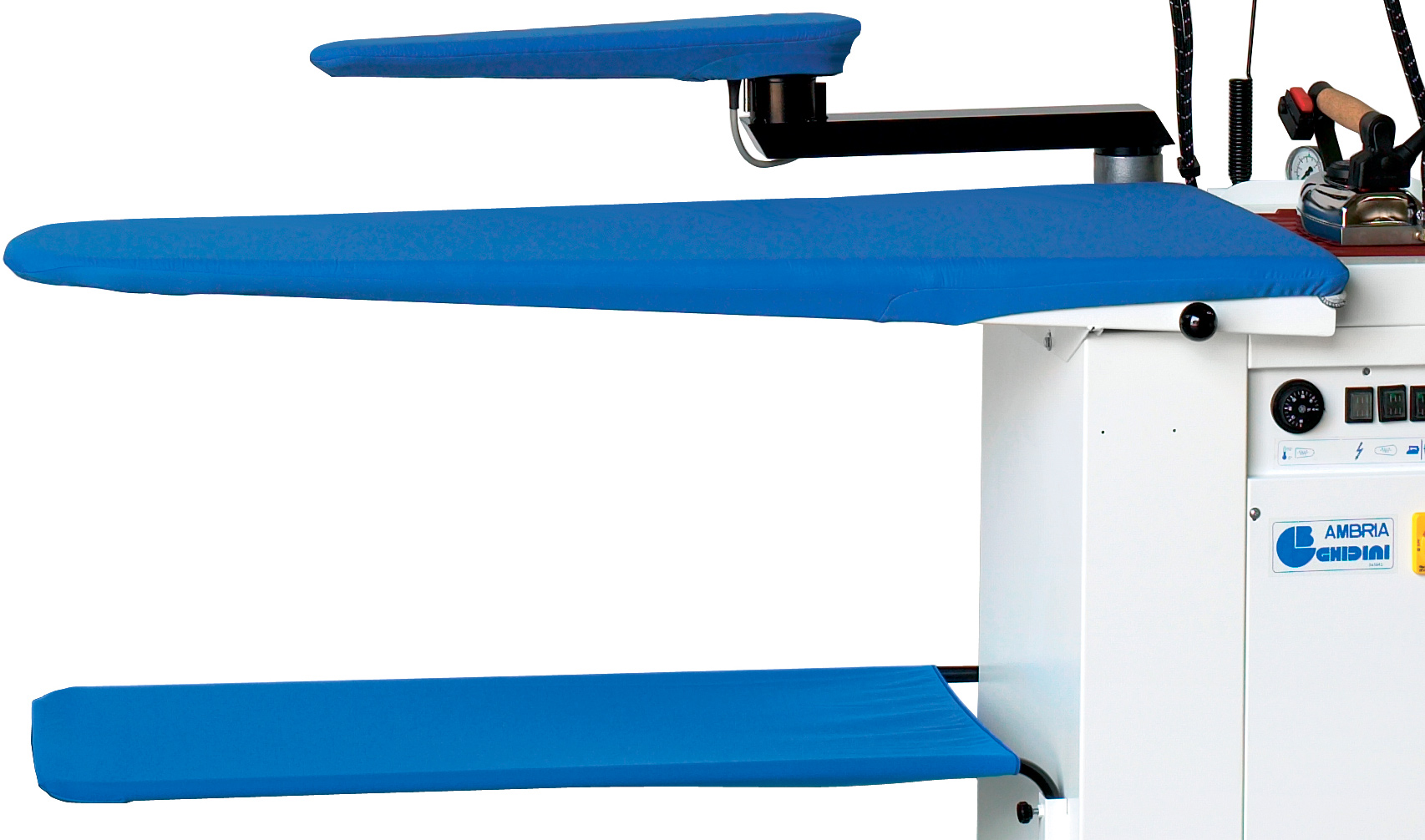 Стол гладильный Ghidini AMBRIA (парогенератор, рукав) с вакуумным прижимом и нагреваемой поверхностью используется в прачечных при отелях уровня 4-5 звезд, пищевых производствах, в химчистках.