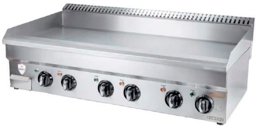 Оснащен открытой жарочной поверхностью с бортами, устойчивыми нескользящими опорами и электромеханической панелью управления.