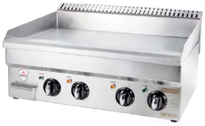 Оснащен открытой жарочной поверхностью с бортами, устойчивыми нескользящими опорами и электромеханической панелью управления.