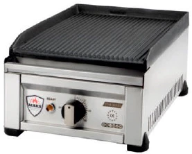 Оснащен открытой рифленой жарочной поверхностью с боковыми и задним бортами, устойчивыми нескользящими опорами и электромеханической панелью управления.