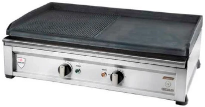 Оснащен открытой комбинированной жарочной поверхностью с боковыми и задним бортами, устойчивыми нескользящими опорами и электромеханической панелью управления.