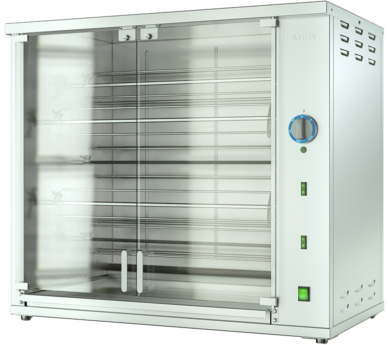 Постоянная скорость вращения шампура и оптимальное расстояние от тушки до ТЭНов обеспечивают равномерную прожарку кур и высокую производительность гриля.
