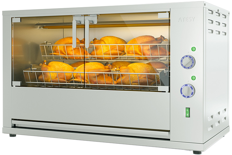 Гриль для кур Atesy Командор-5Э-Т-380 (карусельный) предназначен для жарки тушек кур, цыплят, куриных окорочков, грудок и других продуктов на предприятиях общественного питания.
