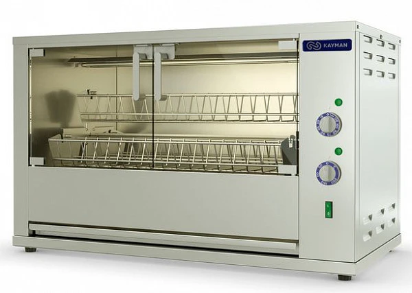 Гриль для кур Kayman ГЭ-4С12-Т A предназначен для жарки тушек кур, цыплят, куриных окорочков, грудок и других продуктов на предприятиях общественного питания и торговли.