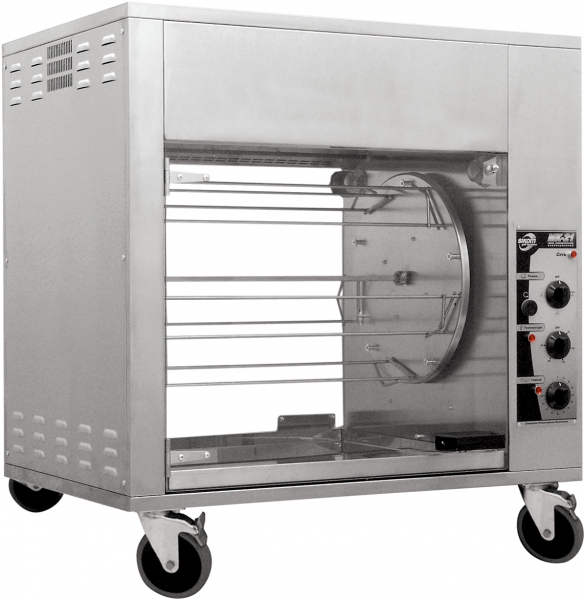 Гриль оснащен 5 шампурами большего размера для поперечного насаживания целых тушек, четвертей тушек или крупных окорочков и 5 шампурами меньшего размера для насаживания небольших окорочков, крылышек или бедер; поддоном для сбора капающего с продуктов жира; сливным краном для удаления излишков жира из поддона; 4 колёсами, таймером для установления времени работы аппарата в том или ином режиме.
