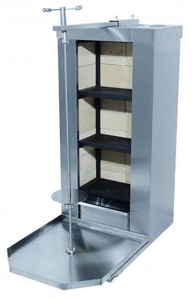 Принцип действия заключается в том, что мясное филе, приготовленное по специальному рецепту, насаживается на вертикальный шампур, который вращается вокруг своей оси около электрических тэнов.