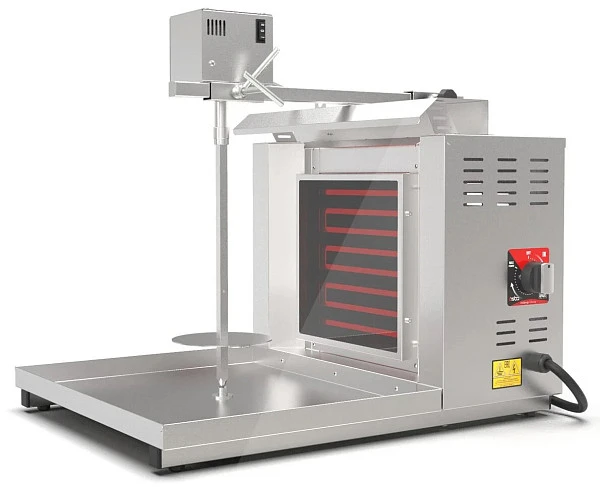 Отличительной особенностью данной модели является электрический привод вращения вертела, что делает процесс приготовления мяса более автоматизированным и позволяет равномерно прожаривать мясо со всех сторон.