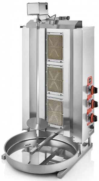 Данное оборудование производит обжарку мяса (курицы, свинины, говядины), сформированного в специальные заготовки цилиндрической формы и размещенного на вертикальный вертел.