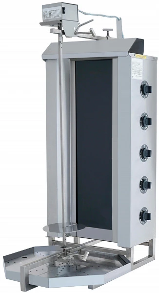 Равномерное приготовление мяса происходит, благодаря вращению заготовки вокруг своей оси напротив нагревательных элементов. По мере готовности, прожаренный слой мяса срезается электрическим или обычным ножом.