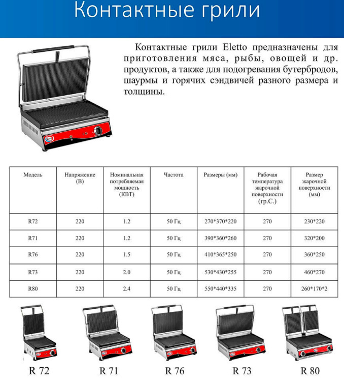 Гриль контактный Eletto R76 предназначен для быстрого обжаривания мяса, птицы, стейков, рыбы, овощей, а также для разогрева продуктов.
