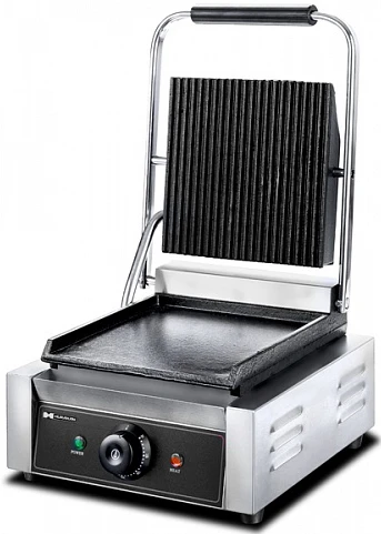 Пресс-гриль имеет рифленую верхнюю поверхность и нижнюю гладкую. Эта особенность аппарата позволяет готовить и разогревать не только мясные продукты, птицу, морепродукты и овощи, но и разнообразить ассортимент предприятия приготовлением яичницы, тостов и хот-догов.