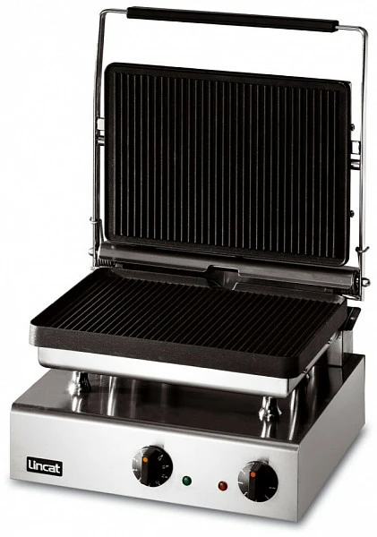 Гриль контактный Lincat GG1P односекционный с верхней и нижней ребристой пластиной предназначен для использования предназначен для жарки мяса, птицы, рыбы, овощей, а также для приготовления стейков, гамбургеров и горячих сэндвичей на предприятиях общественного питания и торговли, специализирующихся на приготовлении фаст фуда.