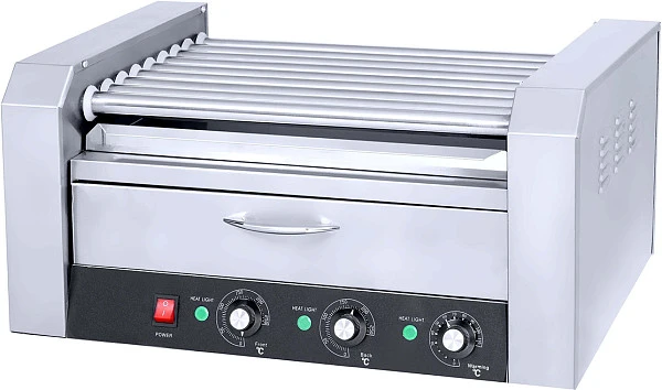 Гриль роликовый AIRHOT RG-9BW с отделением для подогрева булочек предназначен для обжаривания и поддержания в горячем состоянии сосисок, сарделек, мясных и рыбных батончиков цилиндрической формы, используемых для приготовления хот-догов в стационарных и мобильных точках общественного питания, в том числе и на АЗС.