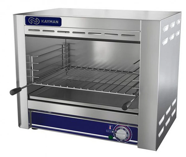 Гриль саламандра Kayman ГСЛ-01 А предназначен для бесконтактного обжаривания стейков и сосисок, подогрева булочек и быстрого разогрева полуфабрикатов на предприятиях общественного питания и торговли.