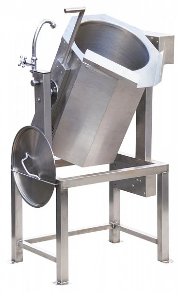 - Для извлечения приготовленного блюда котел оснащен системой опрокидывания находящейся на левой стойке опоры.
