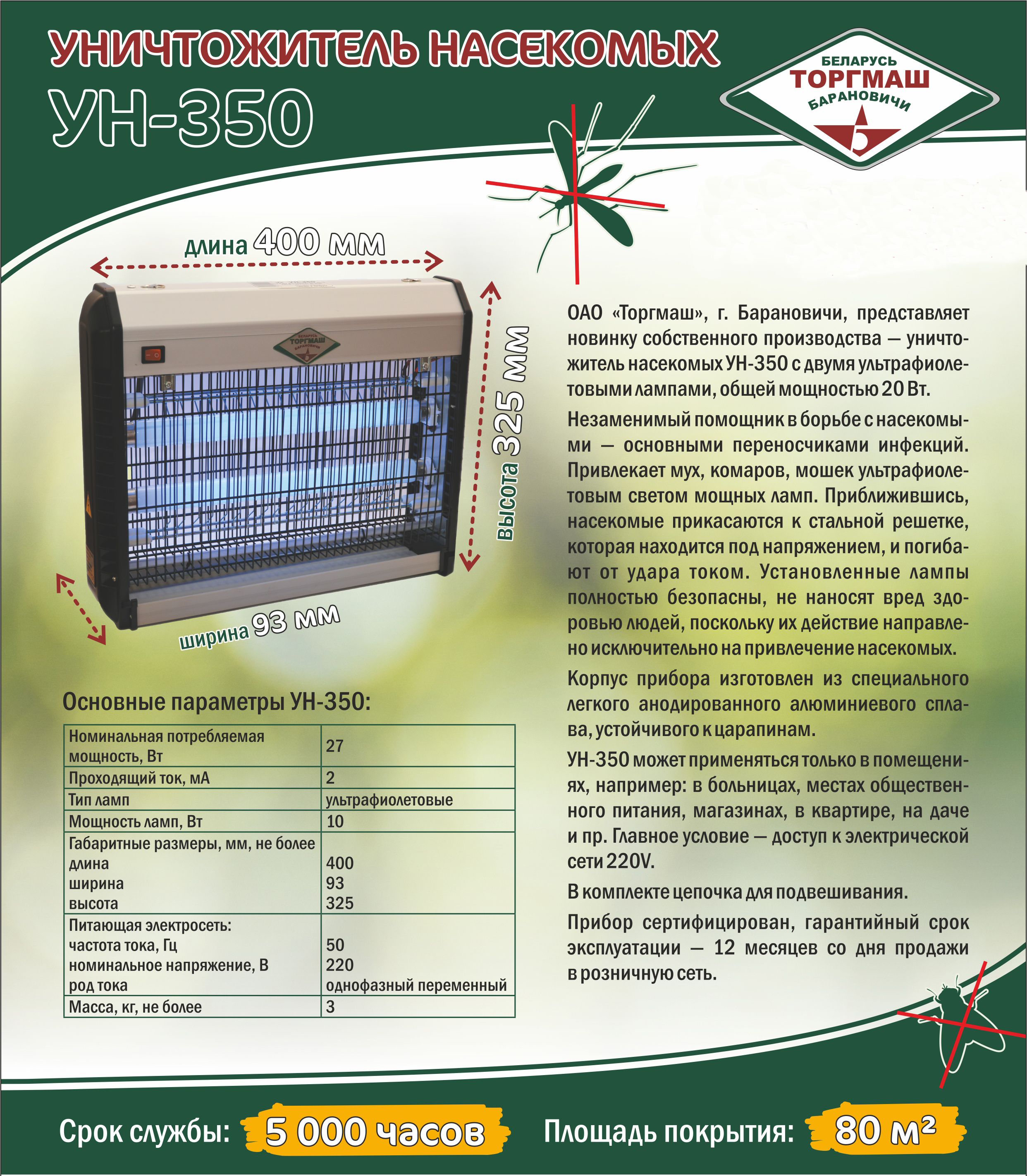Инсектицидная лампа Торгмаш УН-350 предназначена для приманивания и уничтожения комаров, ос, мух, мотыльков и других летающих вредителей с помощью электрического тока. Привлекает мух, комаров, мошек ультрафиолетовым светом мощных ламп. Приблизившись, насекомые прикасаются к стальной решетке, которая находится под напряжением, и погибают от удара электрическим током. Установленные лампы полностью безопасны, не наносят вред здоровью людей, поскольку их действие направлено исключительно на истребление насекомых.
