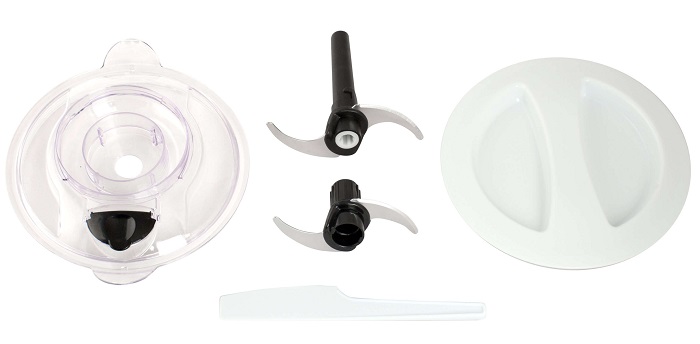 В комплект поставки входят лопатка для снятия измельченного продукта со стенок чаши и крышка для хранения.