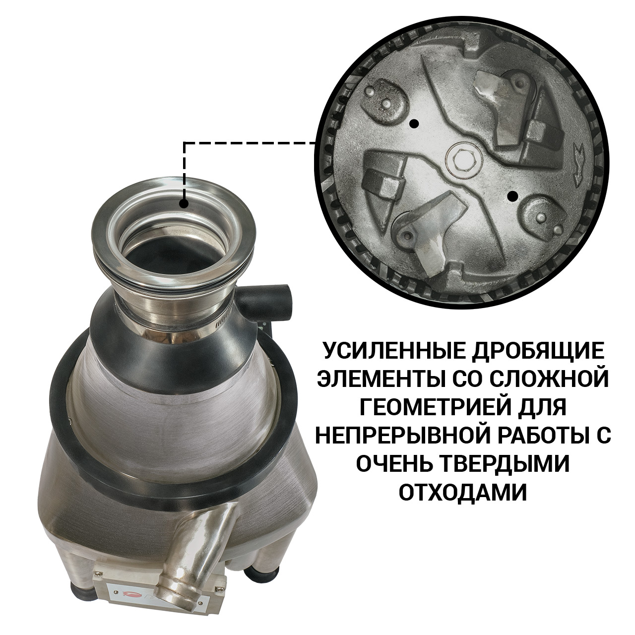 Обладает высокой производительностью и способен легко измельчить и переработать даже самые твердые и плотные остатки пищи.
