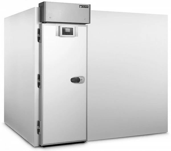 Камера представляет собой модульный элемент, который легко вписать в любое помещение. Модуль состоит из белых металлических панелей с толщиной изоляции 70 мм. Пол также с изоляцией 70 мм, оснащен удобным порогом для ввоза тележки. Внутри камеры установлен алюминиевый бампер.
