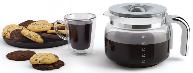 В комплект поставки входят стеклянный кувшин для кофе на 10 чашек с ручкой и крышкой, многоразовый фильтр с ручкой и мерная ложка для молотого кофе.