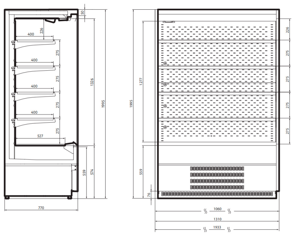 Длина витрины с боковинами, мм 1935