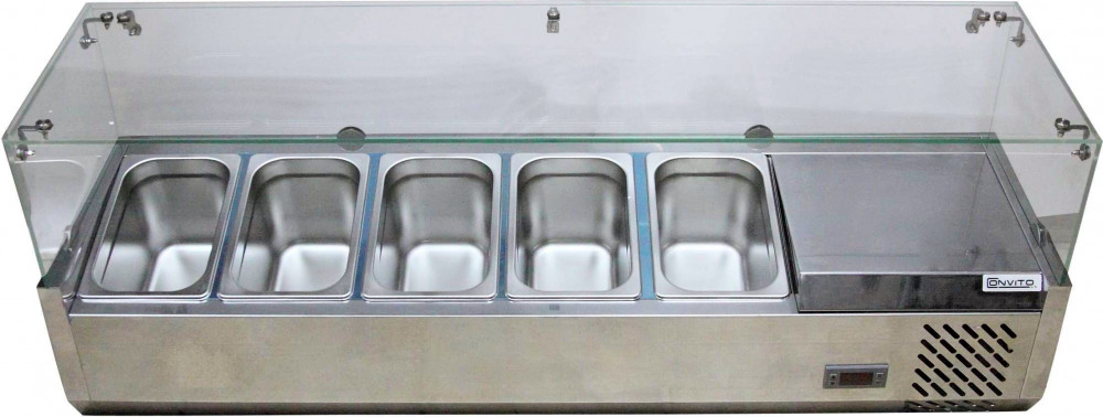 Настольная охлаждаемая витрина (витрина для ингредиентов) Convito RT-1200L предназначена для кратковременного хранения ингредиентов при приготовлении пиццы и салатов, а так же демонстрации и продажи предварительно охлажденных пищевых продуктов в гастрономических ёмкостях на предприятиях торговли и общественного питания.