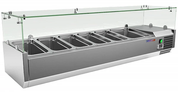 Холодильная витрина для ингредиентов Cooleq VRX 2000/380 предназначена для кратковременного хранения ингредиентов при приготовлении пиццы и салатов, а так же демонстрации и продажи предварительно охлажденных пищевых продуктов в гастрономических ёмкостях на предприятиях торговли и общественного питания.