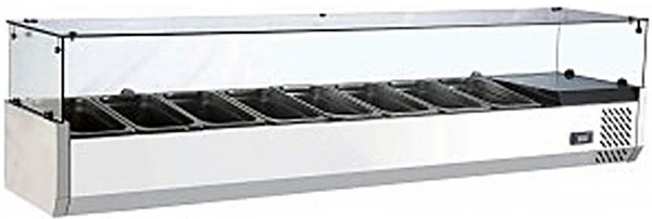 Холодильная витрина для ингредиентов Enigma RT-1800L-2 со стеклянной крышкой предназначена для кратковременного хранения ингредиентов при приготовлении пиццы и салатов, а так же демонстрации и продажи предварительно охлажденных пищевых продуктов в гастрономических ёмкостях на предприятиях торговли и общественного питания.
