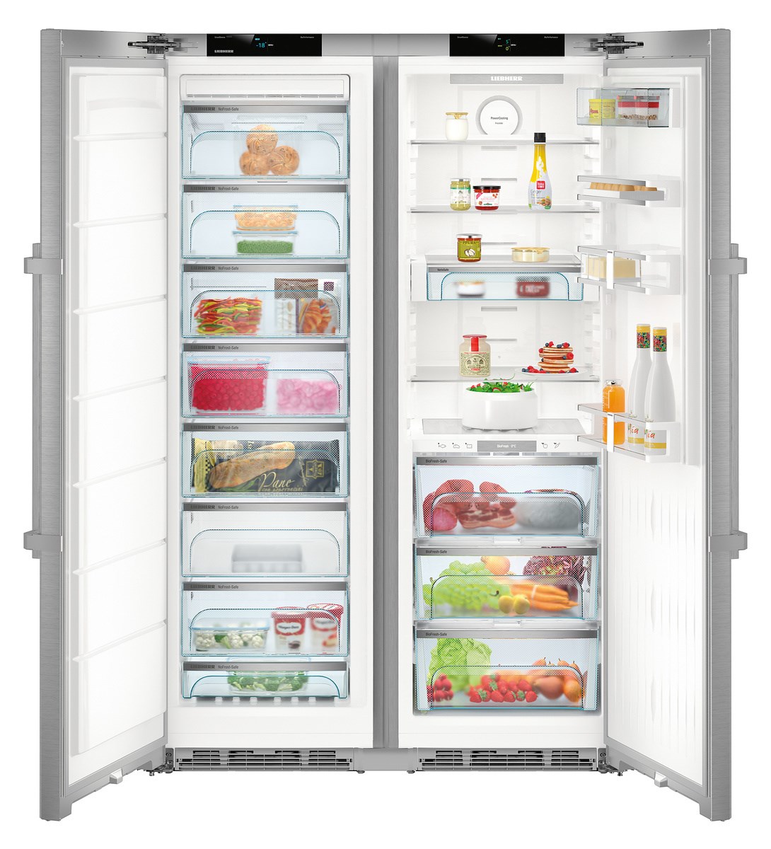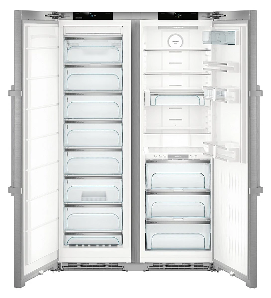 Liebherr SBSes 8773 — холодильник Side-by-side объемом 635 л. Имеет сенсорное управление и 2,4-дюймовый сенсорный цветной TFT-дисплей, где отображаются индикаторы температуры во всех отделениях. В зоне свежести BioFresh поддерживается оптимальная температура для долгого хранения овощей, фруктов, мяса и рыбы. На покрытии SmartSteel не остается отпечатков пальцев и царапин.