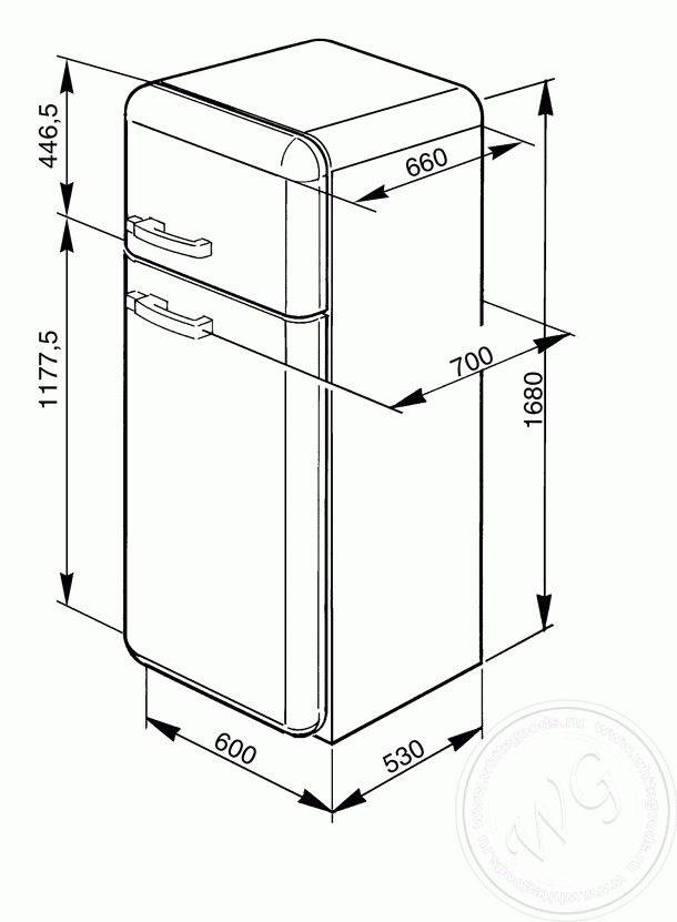 При размещении рядом со стеной, необходимо оставлять зазор минимум 175 мм в сторону открывания двери холодильника.