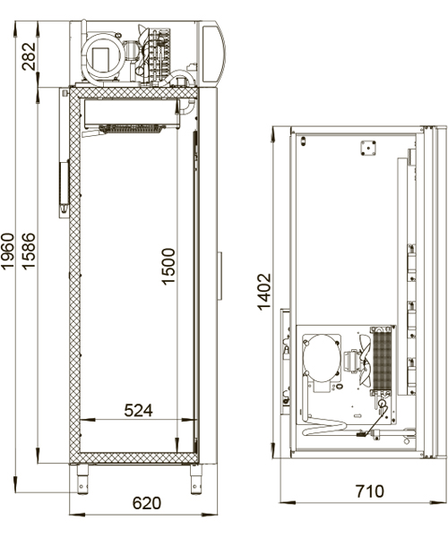 Оснащен профессиональной динамической холодильной системой (с медно-алюминиевыми батареями конденсатора и испарителя и мощными осевыми вентиляторами), обеспечивающей эффективное и равномерное охлаждение продуктов на всех полках шкафа.