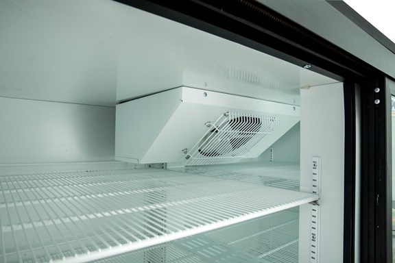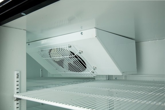 Оснащен профессиональной динамической холодильной системой (с медно-алюминиевыми батареями конденсатора и испарителя и мощными осевыми вентиляторами), обеспечивающей эффективное и равномерное охлаждение продуктов на всех полках шкафа.