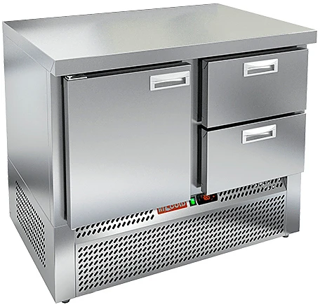 Холодильный стол Hicold SNE 12/TN О с выдвижными ящиками, одной дверью и нижним расположением агрегата предназначен для обработки ингредиентов для приготовления блюд, а также кратковременного хранения скоропортящихся продуктов и напитков на предприятиях общественного питания и торговли.