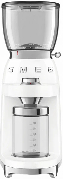 Кофемолка Smeg CGF01WHEU предназначена для использования в частных домах и квартирах для размола кофейных зерен. Модель выполнена в стиле 50-х годов. Корпус изготовлен из окрашенного металла, конические жернова и магнитный держатель съемного контейнера для молотого кофе - из нержавеющей стали, контейнеры для зерен кофе и молотого кофе - из Tritan™.