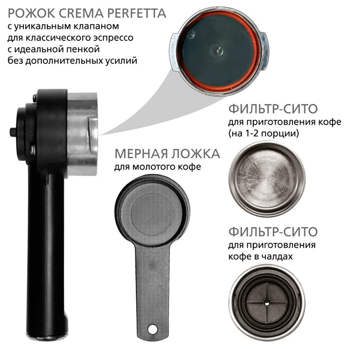 Запатентованный герметичный держатель фильтра гарантирует долгую вкуснейшую пенку Сrema Perfetta при каждом использовании.