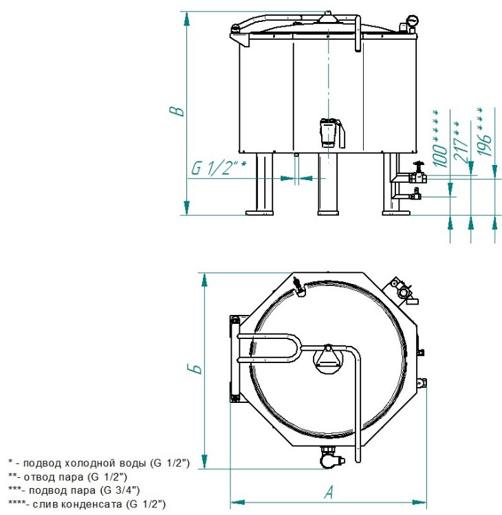 Котел пищеварочный Abat КПЭМ-160П стационарный серии П (стационарный паровой) предназначен для приготовления бульонов, третьих блюд, кипячения воды.
