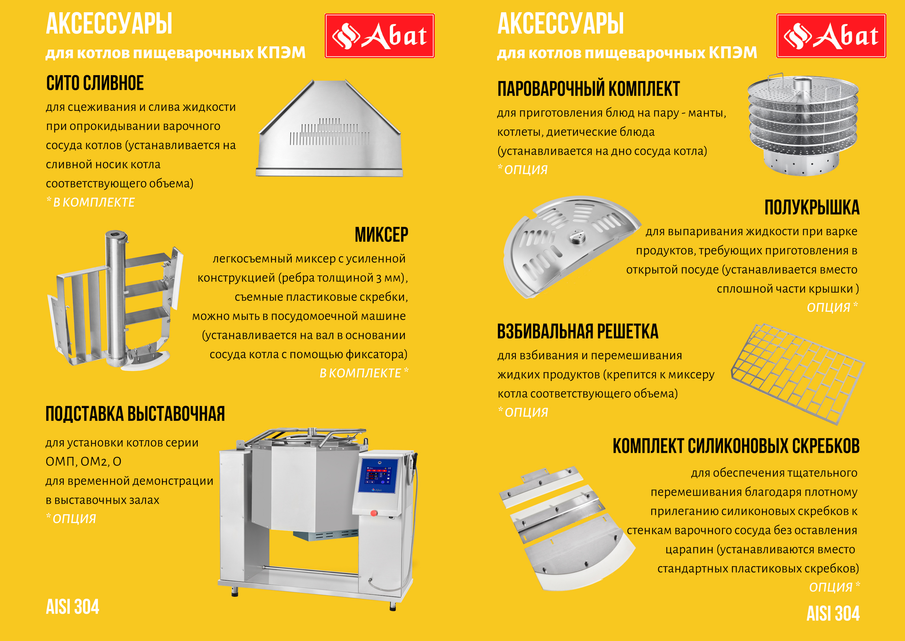 Благодаря своему функционалу при помощи котла Abat серии ОМП можно готовить самые разнообразные первые, вторые и третьи блюда - супы, каши, пюре, омлеты, карри, плов, жаркое, рагу, тушеные блюда, соусы, компоты и десерты.