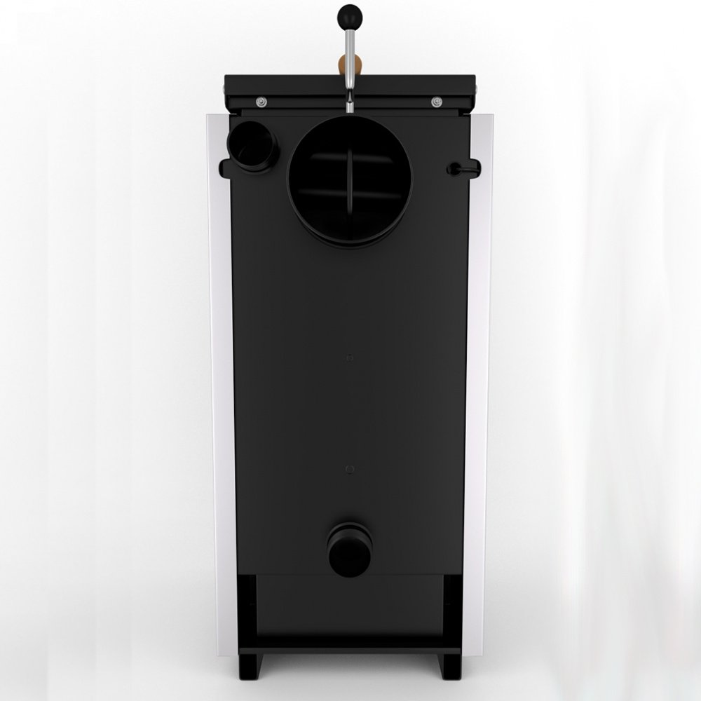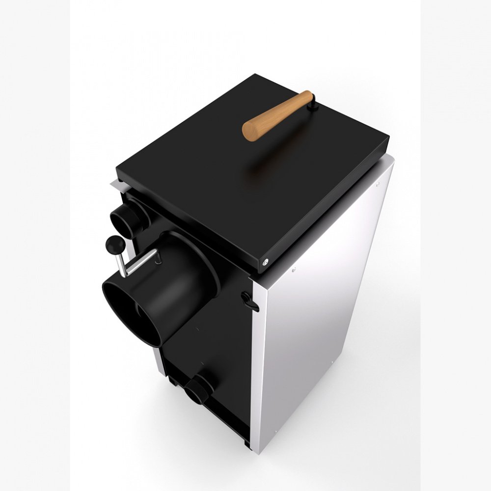 Верхняя загрузка обеспечивает не только удобство загрузки прямо из ведра, но и позволяет равномерно заполнить загрузочную камеру в отличие от котлов с передней загрузкой через дверцу (особенно многосекционных с длинным теплообменником), которые требуют дополнительных затрат времени и усилий для равномерного распределения топлива по загрузочной камере