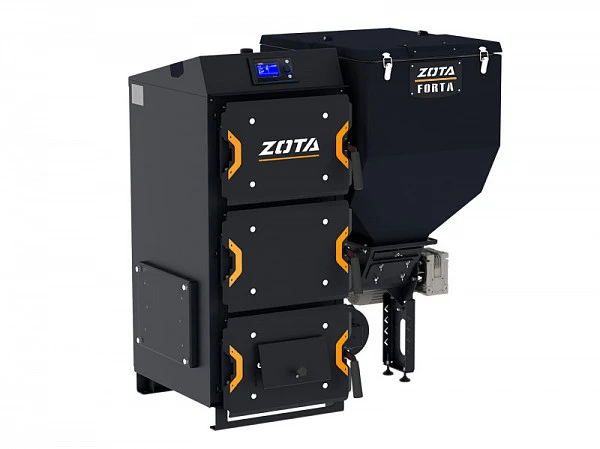 Котел твердотопливный Zota Forta 15 с автоматической подачей топлива. Предназначен для теплоснабжения индивидуальных жилых домов и зданий коммунально - бытового назначения, оборудованных системой водяного отопления с принудительной циркуляцией. состоит из теплообменника,механизма подачи топлива, ретортной горелки с поворотной чашей, топливного бункера и пульта управления.
