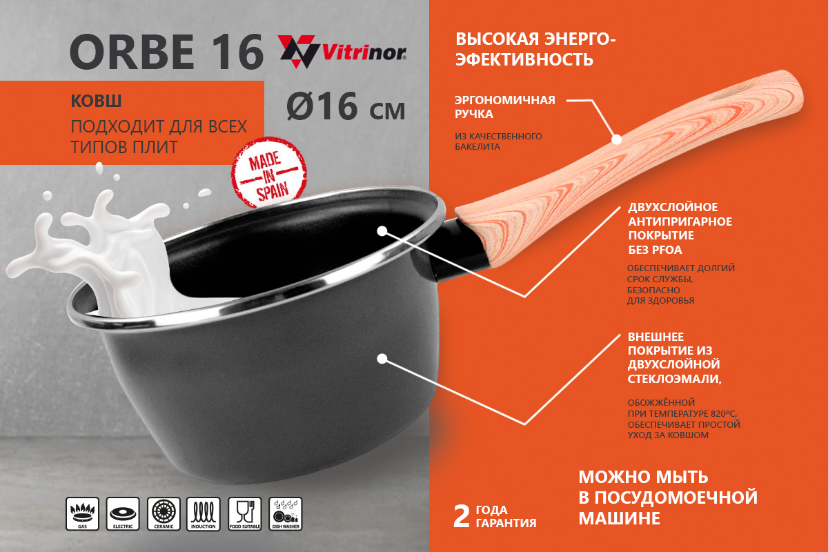 Корпус ковша Vitrinor Orbe 16 изготовлен из стали с ферромагнитными свойствами, что обеспечивает быстрый нагрев и высокую энергоэффективность, особенно при использовании продукции Vitrinor на электрических плитах. Устанавливайте меньшую мощность нагрева на своей плите для достижения лучших результатов и экономии электроэнергии.