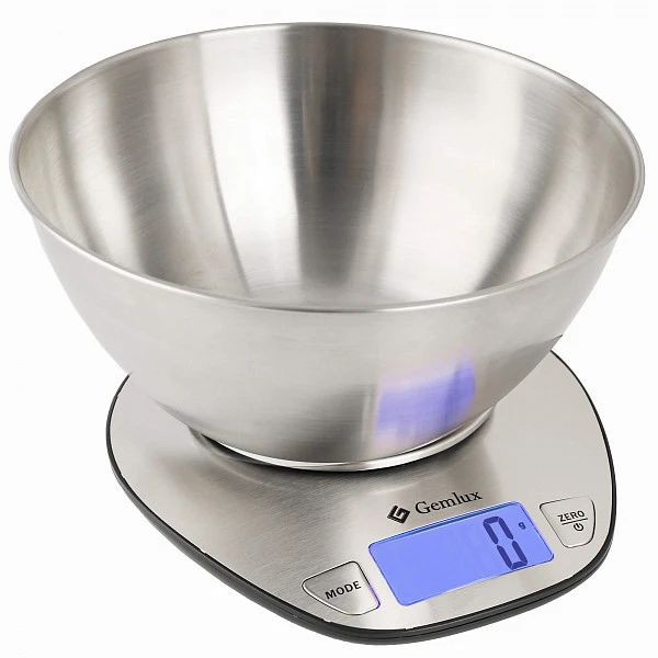 Диапазон взвешивания кухонных весов Gemlux GL-KS5SB – от 2 г до 5 кг, точность взвешивания – 1 г. Предусмотрена функция сброса веса тары, измерения веса в граммах и объема жидкости в миллилитрах. Питание осуществляется от 2 батарей AAA (батареи в комплект поставки не входят).