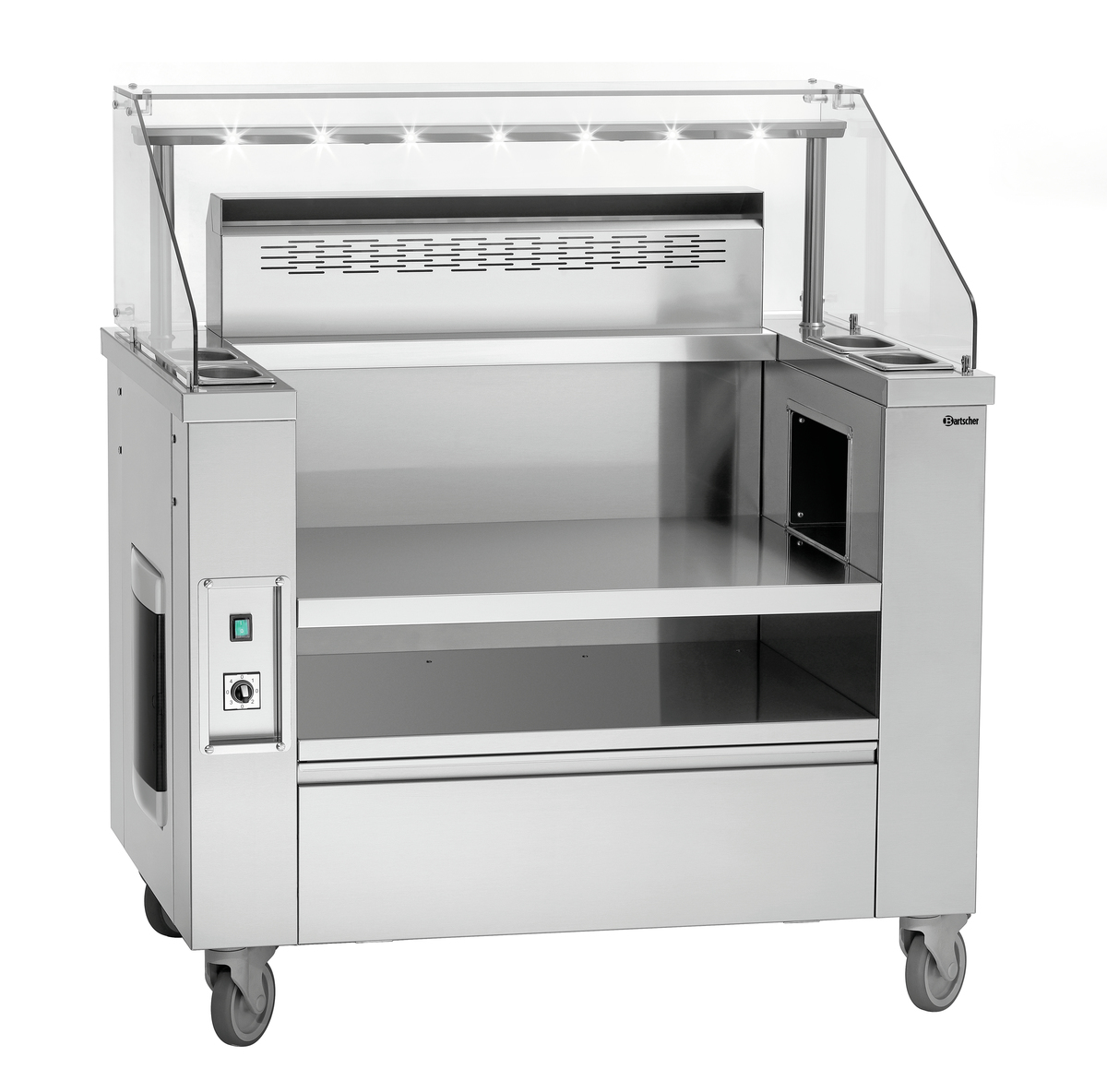 Кулинарная станция Bartscher KST2200 Plus для профессионального выступления в области открытой кухни. От индукционной плиты с 230 В до крепкой пластины гриля серии 650 с 400 В — с количеством до 2 настольных приборов для особенно многообразного использования в области общественного питания, кулинарных мероприятий и открытой кухни.