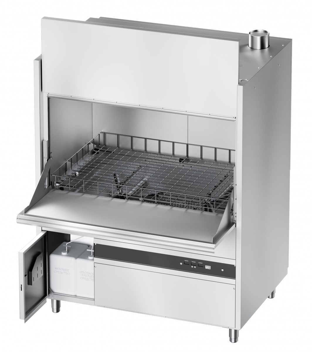 комплектуется выкатной тележкой с роликами, используемой для установки на нее различной кухонной утвари и имеет две возможные комплектации: