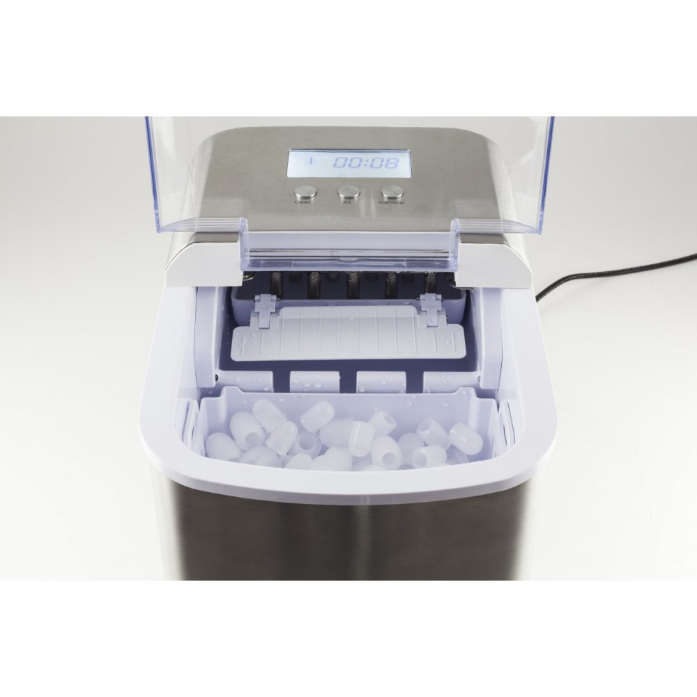 Наблюдать за приготовлением льда можно через специальное прозрачное окошко в крышке прибора. Корпус из высококачественной стали надежно защищает внутренние элементы устройства от механических повреждений. Льдогенератор отличается простотой в уходе.