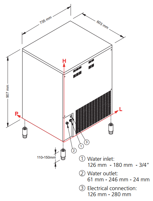 Для монтажа льдогенератора необходимы подводка холодной воды (вентиль 3/4″), а также отвод воды (сток Ø 24 мм).