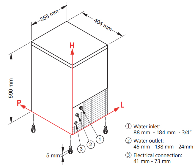 Для монтажа льдогенератора необходимы подводка холодной воды (вентиль 3/4″), а также отвод воды (сток Ø 24 мм).