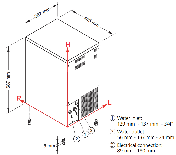 Для монтажа льдогенератора необходимы подводка холодной воды (вентиль 3/4″), а также отвод воды (сток Ø 24 мм).