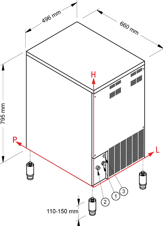 Для монтажа льдогенератора необходимы подводка холодной воды (вентиль 3/4″), а также отвод воды (сток Ø 24 мм).