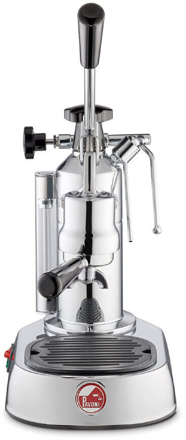 Леверная кофемашина La Pavoni LPLELQ01EU — полупрофессиональная модель из серии Lusso с корпусом и капучинатором из хромированной латуни. Основание изготавливается из стали, а поставка для чашек выполнена из пластика. Рукоять рычага, кнопка подачи пара и крышка бойлера — из бакелита, который не нагревается и имеет приятную шероховатую поверхность, с которой не соскальзыват руки.