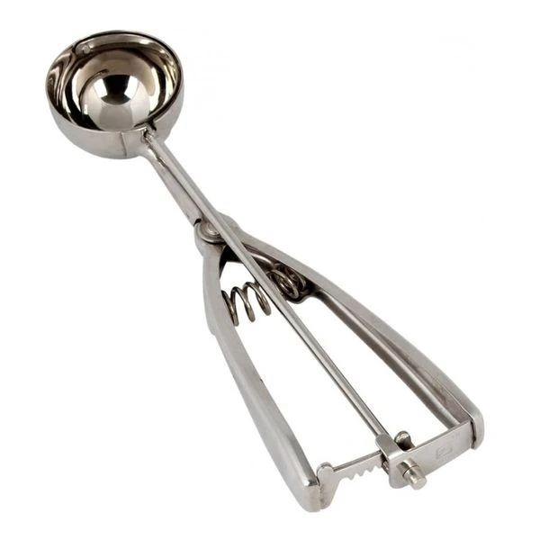 Круглая ложка из пищевого металла позволяет удобно черпать замороженную массу и выкладывать ее аккуратными шарами.